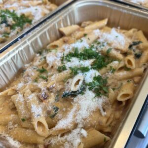 Pasta met spek, prei en raclette kaassaus. Om te gratineren in de oven. aantal